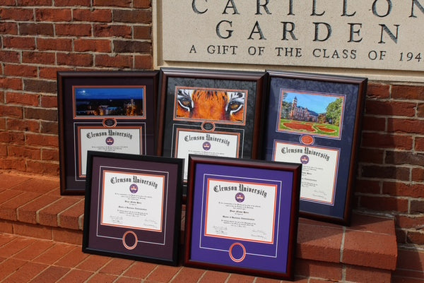 We specialize in framing Clemson University diplomas. You can preserve your diploma in a custom frame. We build all of our frames in-house – from the frame to the mats and etching to the installation – to guarantee the quality. You have worked hard for your degree, trust us to show your diploma in the best light possible.